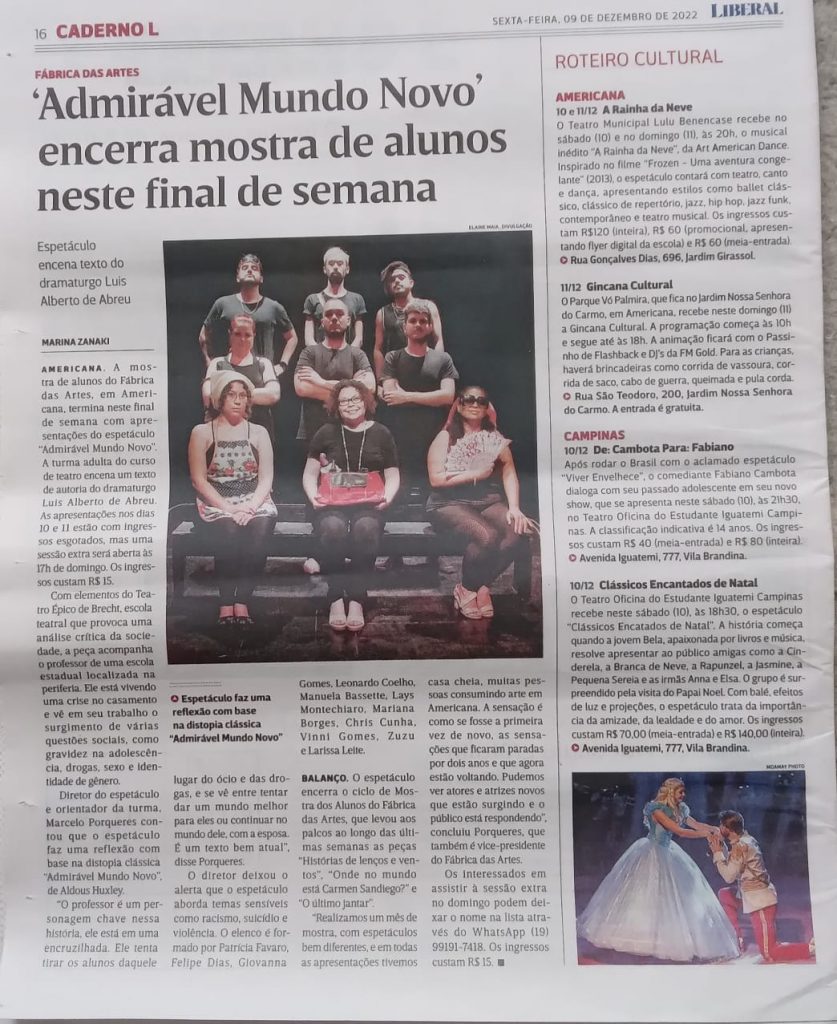 Mídia Mídia 16/08/2024 316Views 0Reactions Turma adulta encerra a programação anual com o espetáculo “Admirável Mundo Novo” What's your reaction?