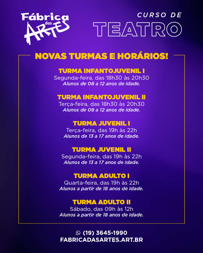 O Curso Livre de Teatro do Fábrica das Artes existe desde 2004, formando mais de 1.300 atores e atrizes. No Fábrica os alunos fazem aulas em um teatro com palco, camarim, iluminação e muito mais. E tudo isso a um custo que cabe no seu bolso, apenas R$170 reais mensais (para pagamento dentro do vencimento), após o vencimento o valor vai a R$ 190,00.